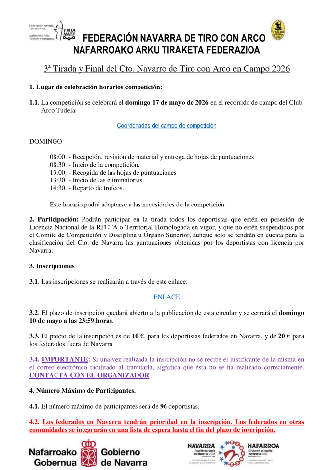 2. Participación: Podrán participar en la tirada todos los deportistas que estén en posesión de Licencia Nacional de la RFETA o Territorial Homologada en vigor, y que no estén suspendidos por el Comité de Competición y Disciplina u Órgano Superior, aunque solo se tendrán en cuenta para la clasificación del Cto. de Navarra las puntuaciones obtenidas por los deportistas con licencia por Navarra.